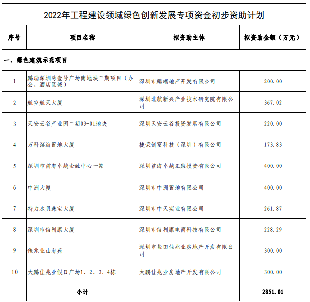 深圳市住房和建設(shè)局關(guān)于2022年工程建設(shè)領(lǐng)域綠色創(chuàng)新發(fā)展專項(xiàng)資金初步資助計(jì)劃的公示